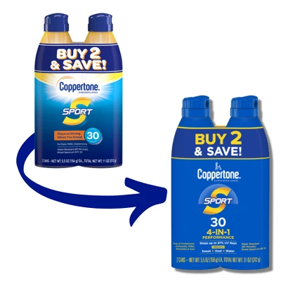 - Two 5.5 ounce bottles of Coppertone Sport SPF 30 Sunscreen Spray