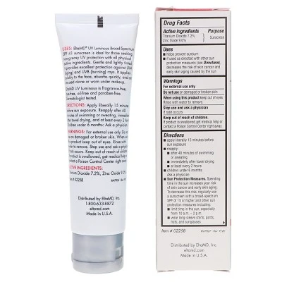 Experience the ultimate protection against sun exposure with Elta MD UV Luminous Broad Spectrum SPF 41. This all physical sunscreen provides superior protection from UVA, UVB and other harsh UV rays to keep your skin safe and healthy. Formulated with a subtle hint of color, this multi-tasking lotion also features color correcting technology that helps to blur imperfections and overlaps invisibly over most skin tones, perfect for post-procedure sun care. Lightweight and fast-absorbing, you’ll love how quickly it soaks into your skin without the greasy residue that can sometimes occur with other sunscreens. Keep your skin looking healthy and vibrant by adding Elta MD UV Luminous Broad Spectrum SPF 41 to your daily skincare routine!
