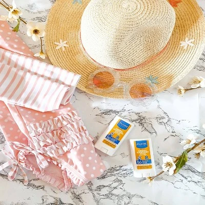 Mustela’s SPF 50 Mineral Sunscreen Stick Face+Body offers gentle, broad-spectrum SPF 50 sun protection for babies, children, and the entire family. Our non-nano, ultra-sheer formula contains 70% organic ingredients, including shea butter, avocado oil, sunflower seed oil, and jojoba. The lightweight texture of our mineral sunscreen blends and absorbs easily and won’t leave a white film on your skin. With the National Science Foundation (NSF) quality seal, the acceptance by the National Eczema Association (NEA) and our rigorous pediatric and dermatological testing, you can rest assured that our Mineral Sunscreen Stick Face+Body contains organic ingredients and is free of harsh chemicals. Our sunscreen is compliant with Hawaii’s sunscreen ingredient requirements. Formulated without chemical UV filters (oxybenzone, avobenzone, octisalate, octocrylene, homosalate and octinoxate), parabens, phthalates, or phenoxyethanol. Mustela’s SPF 50 Mineral Sunscreen Stick Face+Body is a waterless product to minimize packaging.