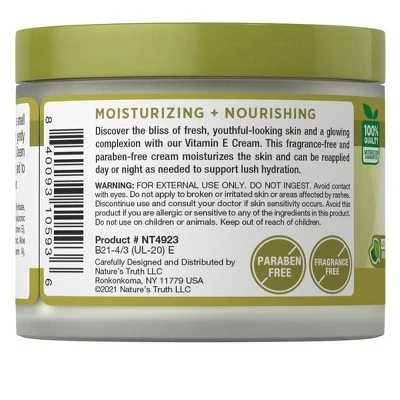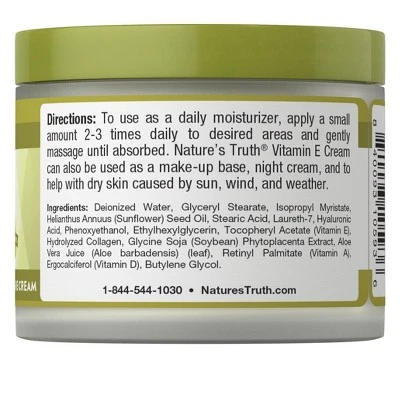 Vitamin E for Skin Care: Vitamin E is an Essential Nutrient that is naturally occurring in many nutritious whole foods. It’s often touted for its important role in Skin Care and can be found in various Supplement forms like Powder, Pills, Softgels, Gummies, Capsules and Tablets. Now it’s available in various luxurious topicals… How to get Vitamin E: There are now many topical agents like Face Masks, Hair Oil, Lotion, Lip Balm, Body Wash, Roll-Ons, Moisturizers and Serums that feature this beneficial nutrient. However, not all are sourced with the same standards of quality. Nature’s Truth has crafted a Professional E-Cream Complex that your skin will crave. How does it stand out? Nature’s Truth’s E-Cream Complex: Discover the bliss of fresh, glowing skin and complexion with our Vitamin E Complex, 4 oz Moisturizer. This Paraben-Free and Fragrance-Free cream nourishes all skin types and can be reapplied day and night to support radiance and hydration. It’s designed with purifying ingredients like Hyaluronic Acid and Aloe Vera Juice for additional nourishment. Simply apply a small amount 2-3 times daily to desired areas and gently massage dry skin to receive all of the moisturizing benefits of Vitamin E!