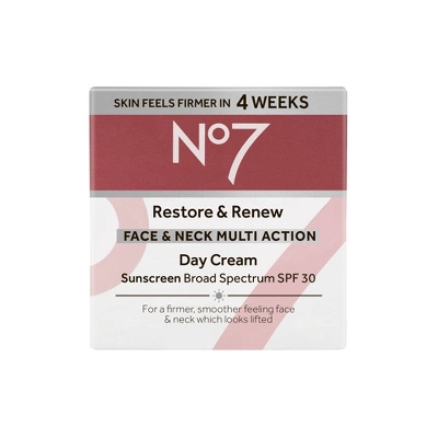 No7 Restore & Renew moisturizer face cream with SPF 30 helps skin feel firmed. Formulated with MATRIXYL 3000 PLUS, No7’s next generation age-defying collagen peptide-based technology, this face cream visibly reduces the appearance of wrinkles. This day cream with ceramides nourishes your skin. The firming complex contains a hydrating blend of hibiscus peptides and hyaluronic acid, while broad-spectrum SPF 30 helps defend and protect skin from harmful UV rays. For best results, use the full No7 Restore & Renew range. Cleanse every morning before applying serum and day cream, then use serum and night cream before bed. No7 is the UK’s best-kept beauty secret with over 85 years of trusted expertise — exceptional beauty shouldn’t be a luxury. (*Consumer study of UK women **Instrumental, skin hydration study using No7 day creams only)