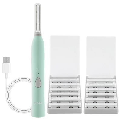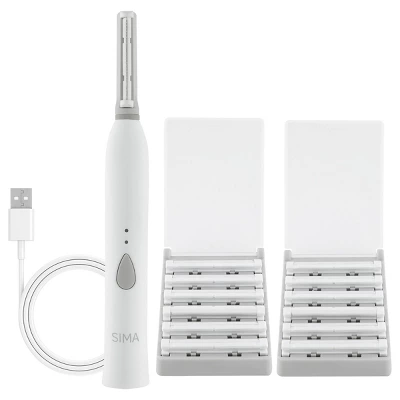 SIMA is a 3-speed rechargeable dermaplaning/women’s hair removal device that harnesses the skin-smoothing power of sonic technology at 15,000 movements per minute to instantly remove unwanted facial hair aka peach fuzz, exfoliate build-up and dead skin cells improve the look of enlarged pores, the feel of rough skin texture, while improving the appearance of uneven skin tone, fine lines and dullness in a safe, painless and effective way to reveal a completely rejuvenated and hair-free complexion. Use SIMA once a week to achieve professional-grade skin smoothing and hair removal results. Upper lip hair and facial hair removal is made easy with SIMA. SIMA is cost efficient, safe and effective for all skin types. The SIMA includes a rechargeable dermaplaning tool, 7 single use dermaplaning tips + BONUS 6 weekly treatments ($9.99 value) – total of 13 weekly treatments included – that consist of medical grade stainless steel blades encased in a patented blade guard exclusively to fit your SIMA device handle, USB charging cord, and operating manual.